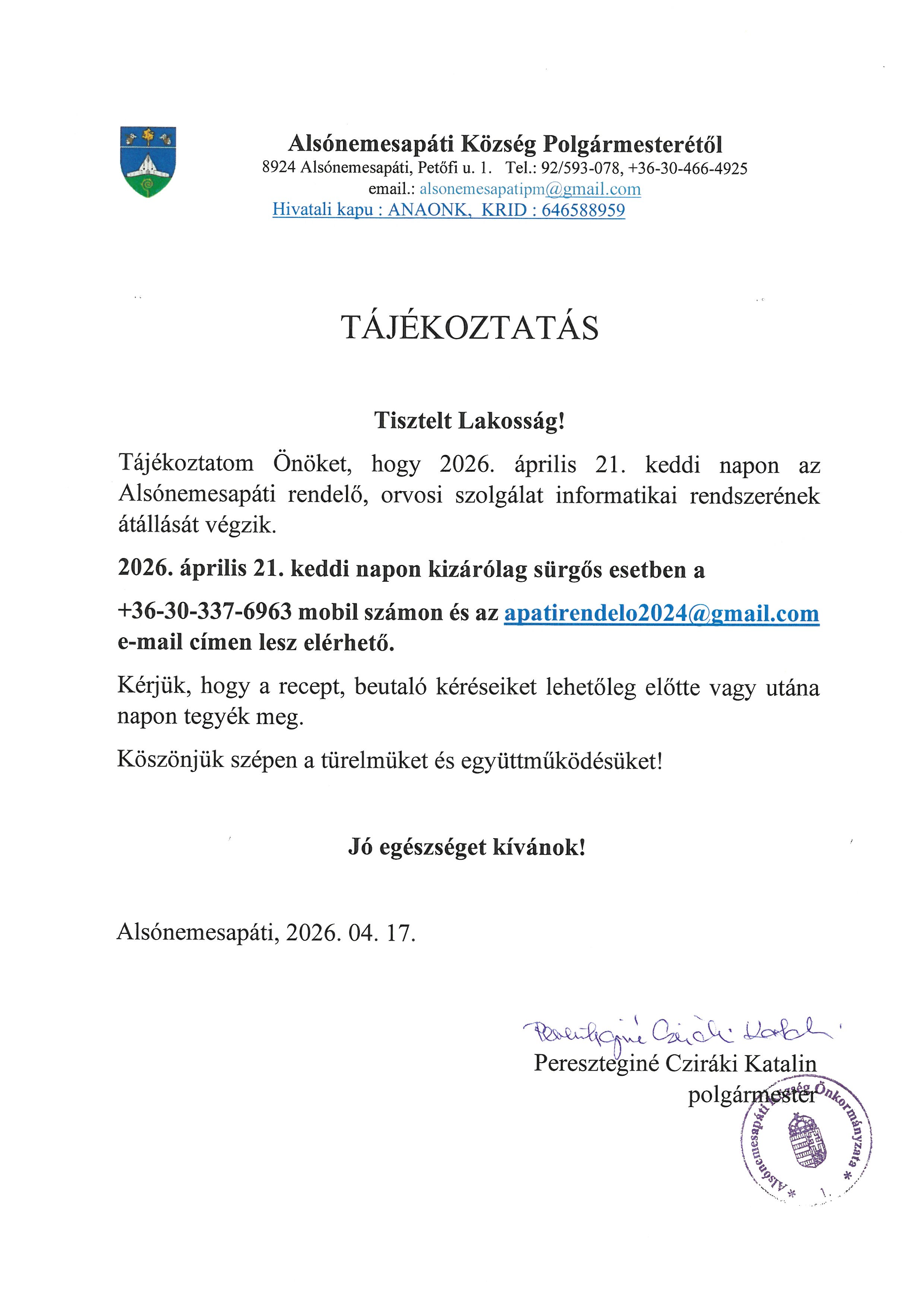 Tájékoztatás – Orvosi rendelő elérhetősége 2026.04.21. napon